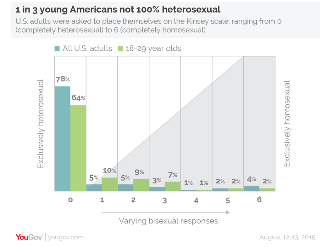 از هر سه جوان امریکایی، یکی خود را صددرصد دگرجنسگرا نمی داند[/caption] نتایج به دست آمده از جوانان بین ۱۸ تا ۲۴ ساله بریتانیایی نشان میدهد در حالی که ۴۳% از آنان خود را در مقیاس کینزی جایی میان ۱تا ۵ ، ۵۲% از آنها خود را در نقطه ۰ یعنی دگرجنسگرایی مطلق یا نقطه ۶ و همجنسگرایی مطلق قرار میدهند. از این میزان، ۴۶% خود را کاملاً دگرجنسگرا و تنها ۶% خود را کاملاً همجنسگرا میدانند. اما نظرسنجی مشابه میان آمریکاییها نشان میدهد که جوانان آمریکایی کمتر از بزرگترهای خود مایلند خود را کاملاً همجنسگرا یا کاملاً دگرجنسگرا بدانند. در حالی که ۸۰% آمریکاییها میگویند که همجنسگرا یا دگرجنسگرای مطلقاند، تنها ۶۶% از آنهایی که زیر ۳۰ سال سن دارند، چنین نظری درباره خود دارند. ۲۹% آنان نیز خود را در طیفی میان اعداد ۱ تا ۵ قرار میدهند و تجربیات مختلفی در چارچوب گرایشهای جنسی داشتهاند.