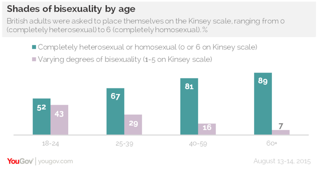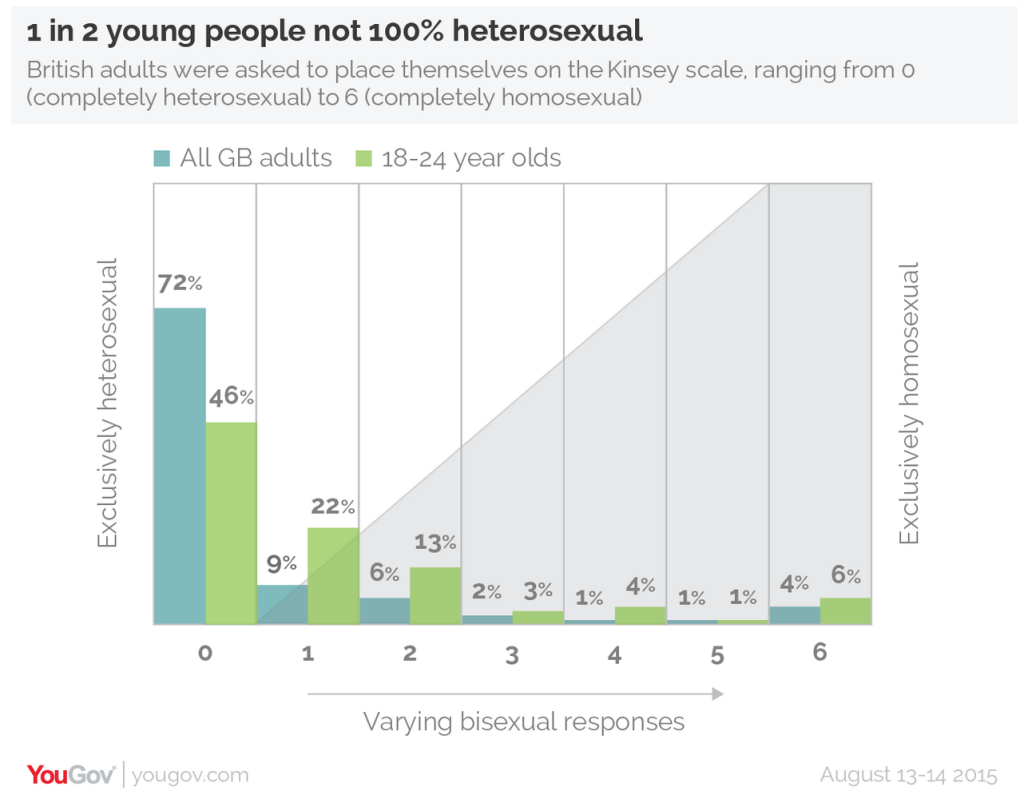 در نظرسنجی که میان بزرگسالان بریتانیایی انجام شده است، تقریباً از هر دو جوان بین ۱۸ تا ۲۴ سال، یک نفر میگوید که صد در صد دگرجنسگرا نیست. در این گزارش، ۲۳% از مردم بریتانیا خود را چیز دیگری غیر از ۱۰۰% دگرجنسگرا معرفی میکنند و این نرخ در میان افراد بین ۱۸ تا ۲۴ سال، تا ۴۹% نیز افزایش مییابد. به طور کلی این گزارش نشان میدهد که ۷۲% بریتانیاییها خود را کاملاً دگرجنسگرا میدانند در حالی که ۴% آنها خود را کاملا همجنسگرا و ۱۹٪ خود را نه کاملاً همجنسگرا و نه کاملاً دگرجنسگرا هویتیابی میکنند.