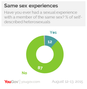 پاسخ امریکاییهایی که خود را دگرجنسگرا میدانند به این سوال که آیا تجربه رابطه با همجنس خود داشتهاید؟ ۸۷درصد پاسخها منفی بوده است این نتایج را اما بیش از هر چیزی میتوان نشانهای از افزایش آگاهی درباره گرایش جنسی دانست. همچنین تعداد زیادی از آمریکاییهایی که خود را دگرجنسگرا میدانند، گفتهاند که تجربیات همجنسخواهانه نیز داشتهاند. ۱۲% از آنان به داشتن رابطه جنسی با جنس موافق اذعان داشته اند که در این میان تعداد زنان دگرجنسگرا (۱۵%) با این تجربیات، دو برابر مردان دگرجنسگرا (۸%) بوده است. باید دانست که جایگیری بین نقاط ۱ تا ۵ در طیف به معنای این نیست که فرد خودش را دوجنسگرا می داند بلکه به معنای داشتن تجربیاتی از گرایش به بیش از یک جنس است. به همین دلیل هم در نمودارهای تولید شده سخن از طیفی از دوجنسگرایی به میان آمده است. در نمودار زیر درجات مختلفی از دوجنسگرایی در گروههای سنی مختلف در امریکا و بریتانیا ارائه شده است"