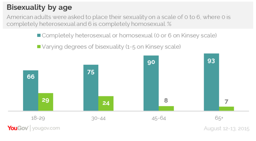 نظرسنجی های جدید نشان می دهند که جوانان در انگلستان و آمریکا بیش از نسلهای قبل گرایش جنسی خود را سیال می دانند و بسیاری از آنها به بیش از یک جنس گرایش دارند. در یکی از آخرین نظرسنجیها و گزارشهای مؤسسه YouGov که درباره جایگیری خودآگاه بزرگسالان آمریکایی و بریتانیایی در طیف مقیاس کینزی (Kinsey Scale) درباره گرایش جنسی آنهاست و در ماه آگوست ۲۰۱۵ منتشر شده است، نتایج قابل توجهی درباره درک این افراد از تمایلشان به جنس مخالف و موافق به دست میدهد.